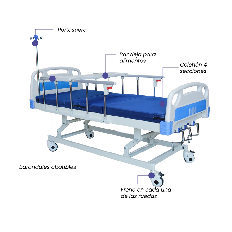 • Incluye colchón articulable de 4 piezas, mesa de alimentos y porta suero