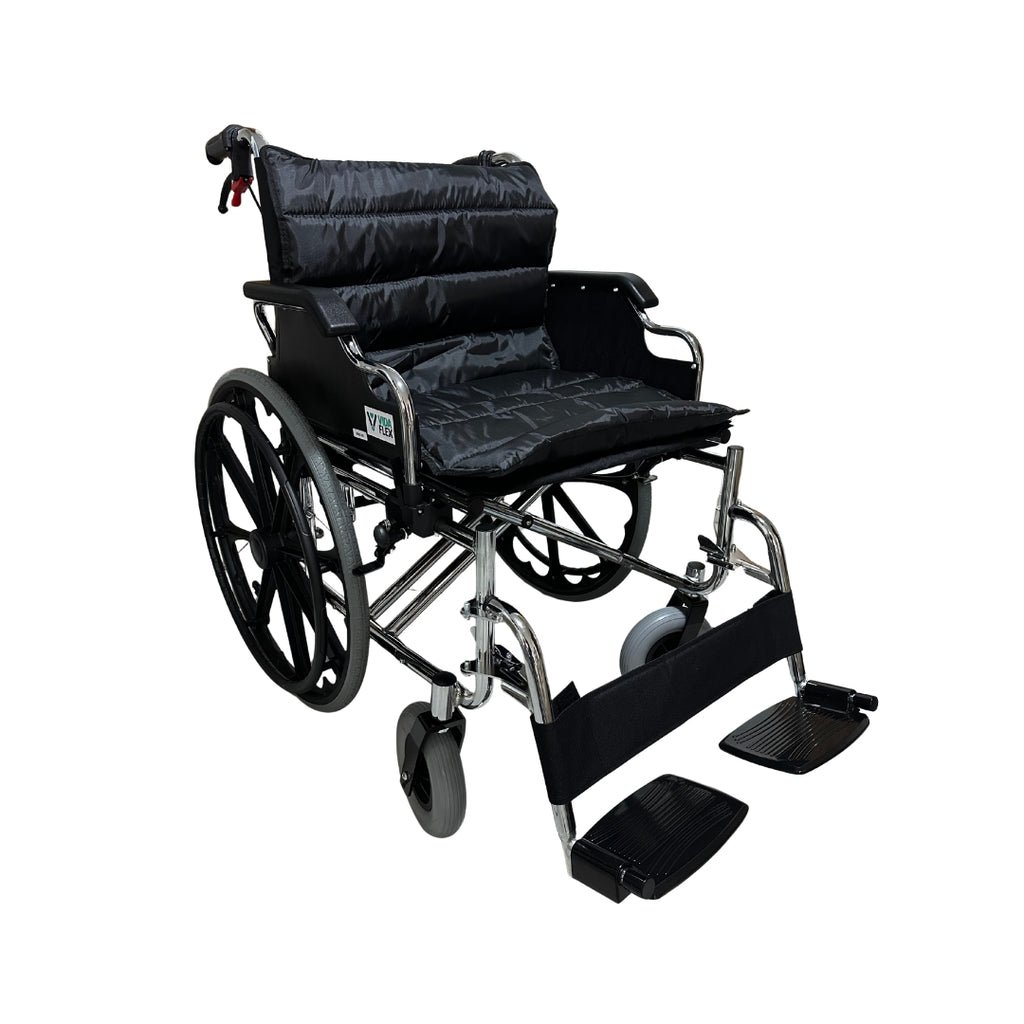 Silla de Ruedas Bariátrica Reforzada, diseñada para brindar mayor resistencia, comodidad y seguridad. Su estructura de acero cromado con doble cruceta garantiza estabilidad, mientras que los reposabrazos abatibles y reposapiés desmontables facilitan el uso y el traslado.