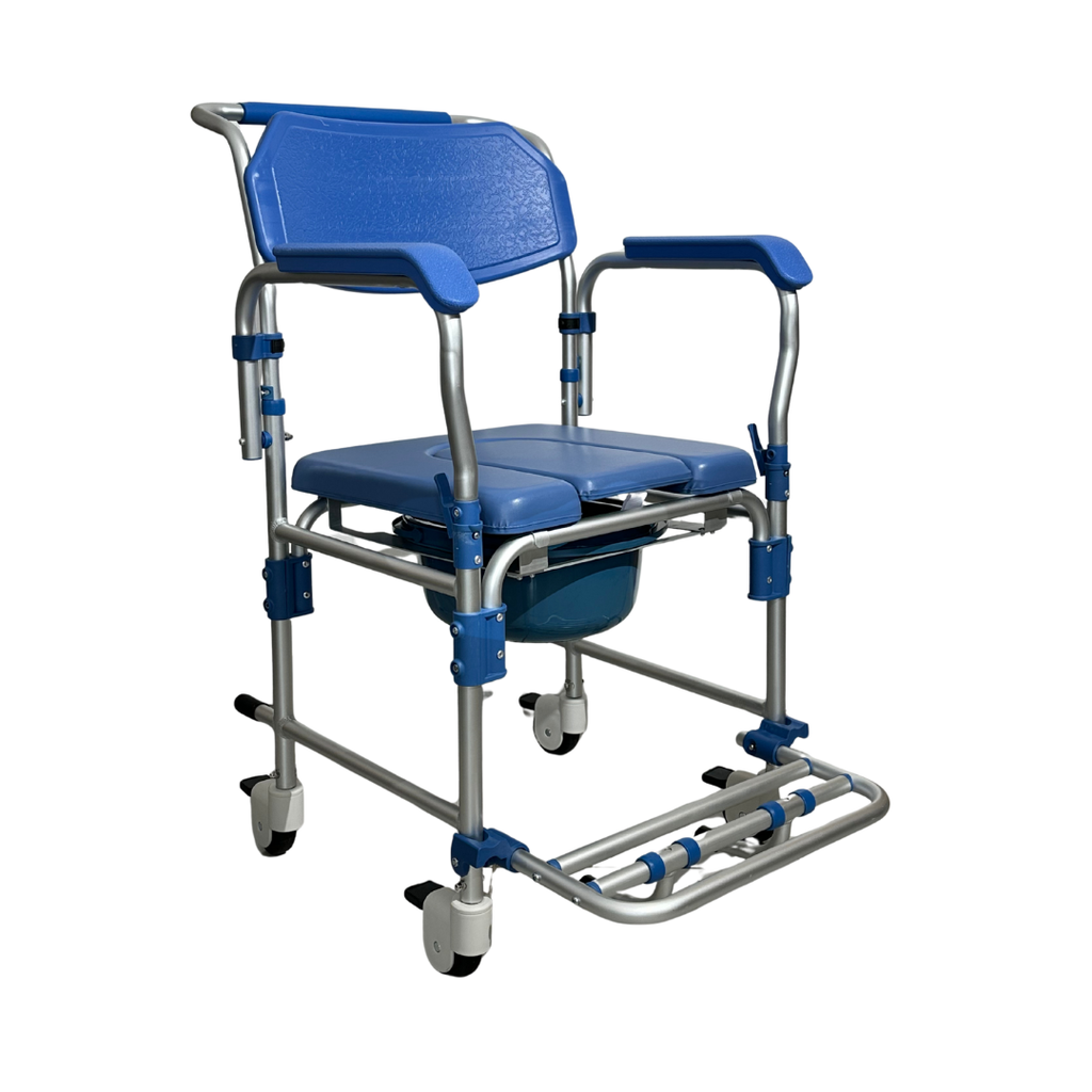 Funciona como silla de ruedas de transporte, silla para ducha y silla sanitaria con orinal, facilitando el cuidado tanto para el usuario como para el cuidador. Su diseño plegable permite guardarla y transportarla fácilmente cuando no está en uso.